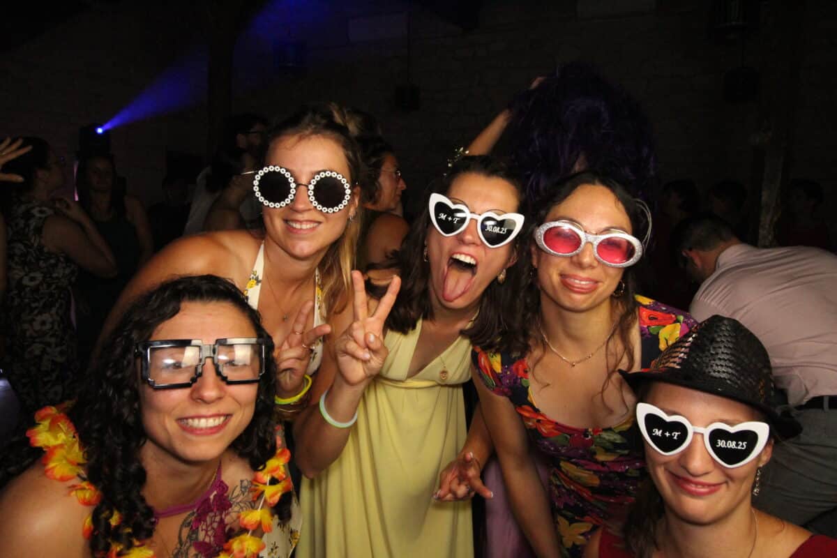 "Cinq femmes souriantes posent pour une photo lors d'une fête, portant des lunettes fantaisistes et des accessoires amusants. Elles sont habillées de robes colorées et ont l'air de s'amuser dans une atmosphère festive avec d'autres personnes à l'arrière-plan."